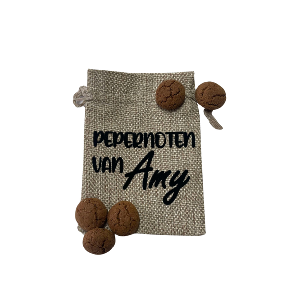 Leuke jute zakje met naam om tijdens de intocht en de dagen daarna de pepernoten in te bewaren.